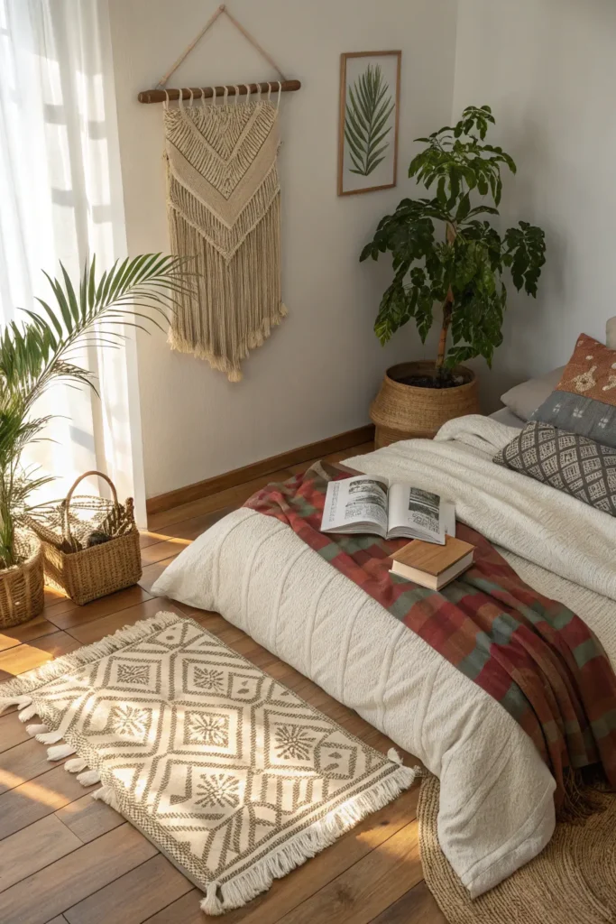 - Modern Boho: Textured throws, patterned rugs, and leafy plants that add life and warmth.