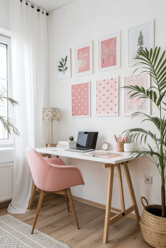 💡 Pro tip: Add a mirror with a pink frame — it reflects light, expands the space, and complements your art beautifully.
